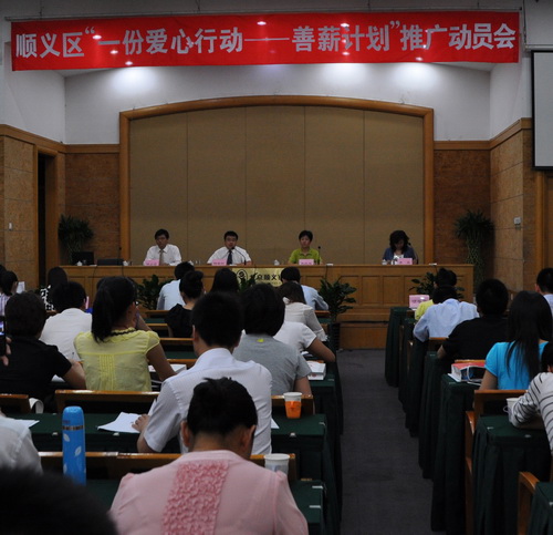 2010年6月8日下午,顺义区“一份爱心行动——善薪计划”推广动员会在顺义宾馆成功举行。顺义区团委副书记杨登科同志主持会议。北京青少年发展基金会副秘书长亚纪英,北京银行顺义支行副行长陈蕊、田小雷,及顺义92家直属团组织团书记和团区委机关干部共120人出席会议。